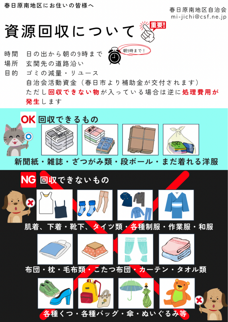 【日 時】1月24日(土)日の出から午前9時まで 雨天決行 【回収場所】ご自宅の玄関先に資源ごみを出してください。(道路沿いに出していただけると助かります) 【回収方法】業者が戸別回収を行います。 ※一方通行で道幅の狭 […]