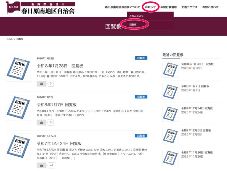 令和7年12月24日 回覧板 ①どんど焼きのおしらせ ②ねこのフン被害について ③春日野の風11月号(全2P) ④の中C・Sだより令和7年秋号 ⑤【整理券配布】ドリームバレーボールin春日(全2P) 紙回覧 […]