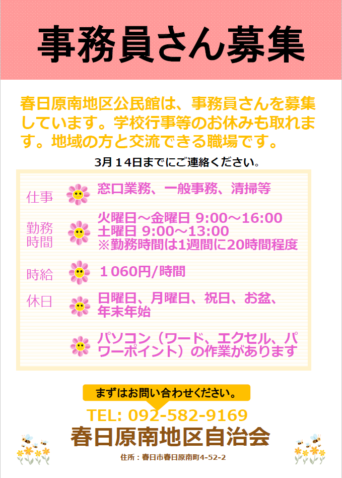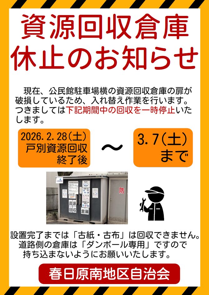2026年2月26日 / 最終更新日時 : 2026年2月26日 春日原南地区自治会 回覧板 令和8年2月26日 回覧板 令和8年2月26日 回覧板 ①資源回収倉庫休止のお知らせ ②南地区公民館事務員募集 ③ぶどうの会花見のお知らせ ④さくらまつりのおしらせ ⑤さくらまつりスタンプラリー参加募集 ⑥節水のお願い 関連のある記事